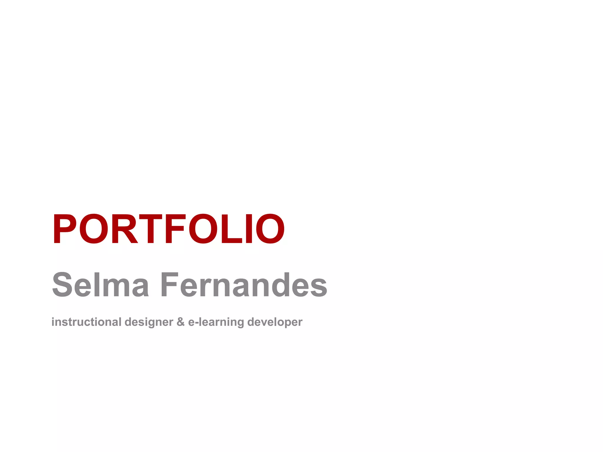 Selma Fernandes works as an instructional designer and e-learning developer. She has experience in instructional design, developing e-learning content, training facilitation, and managing learning management systems. Some of her skills include instructional design, content creation, online facilitation, and training evaluation. She has developed multiple online courses on topics such as public accountability, procurement, and management.