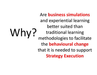 The document discusses the advantages of using business simulations and experiential learning over traditional learning methods for effective strategy execution, highlighting that 57% of firms struggle with this. It emphasizes that adult learning principles and higher retention rates from simulations lead to better behavioral change and deeper understanding. Additionally, the document outlines the concept of a VUCA world, stressing the importance of adaptability in the face of volatility, uncertainty, complexity, and ambiguity.
