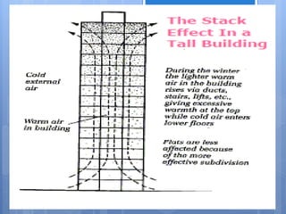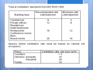 Ventilation is the process of changing or replacing air in an enclosed space to control air quality by removing contaminants and introducing outside fresh air. It is needed to maintain oxygen levels, remove carbon dioxide, control humidity, prevent heat buildup, and dilute odors and other contaminants. Ventilation can be natural through wind and stack effects, or mechanical using fans. Standards recommend minimum air change rates to ensure adequate indoor air quality and occupant comfort. Factors like air temperature, humidity, airflow patterns, and rates must be properly controlled.