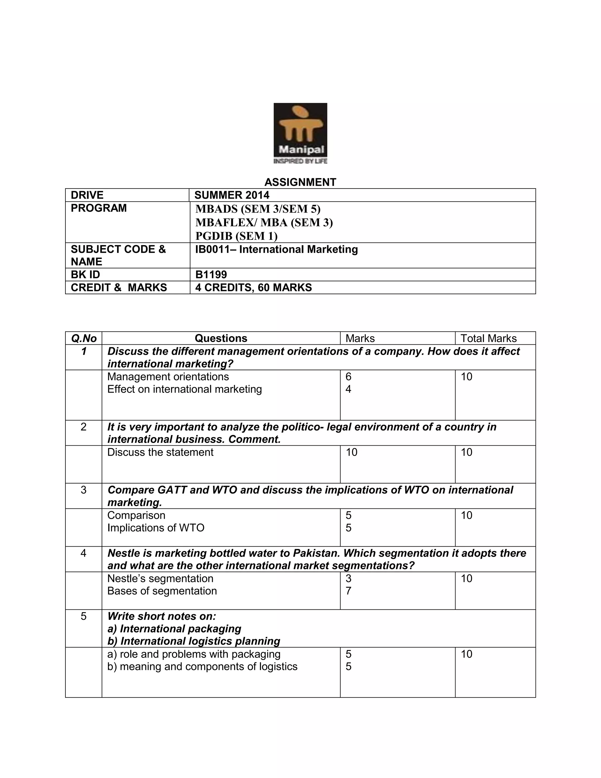This document provides the assignment details for an International Marketing course. It includes 6 questions worth a total of 60 marks. The questions cover topics like management orientations and their effect on international marketing, analyzing the politico-legal environment of countries, comparing GATT and WTO and discussing implications for international marketing, analyzing Nestle's market segmentation in Pakistan and other bases for segmentation, writing short notes on international packaging and logistics planning, and explaining pricing and costing for exporting a selected product. Students are instructed to answer all questions, with 10 mark questions being approximately 400 words each.