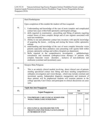 - Assessment includes clinical assessments, final exams, and topics like contact lenses, binocular vision, squints, orthoptics, and vision therapy.