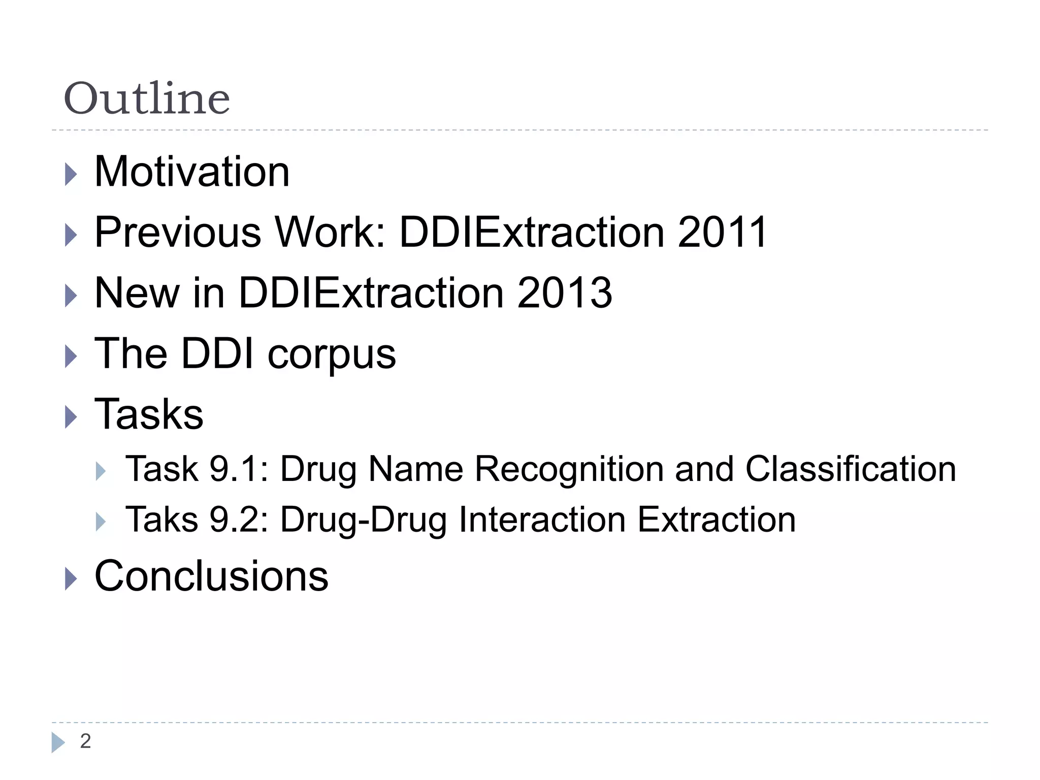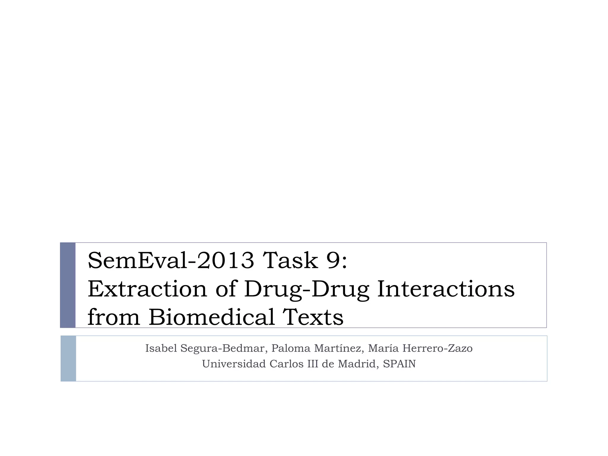 The document discusses the SemEval-2013 Task 9 focused on the extraction of drug-drug interactions (DDIs) from biomedical texts. It outlines two main tasks: drug name recognition/classification and DDI detection/classification, using an expanded dataset that contains annotations for various pharmacological substances. Results indicate improvements in DDI extraction methodologies compared to previous efforts, highlighting better accuracy with DrugBank over Medline.