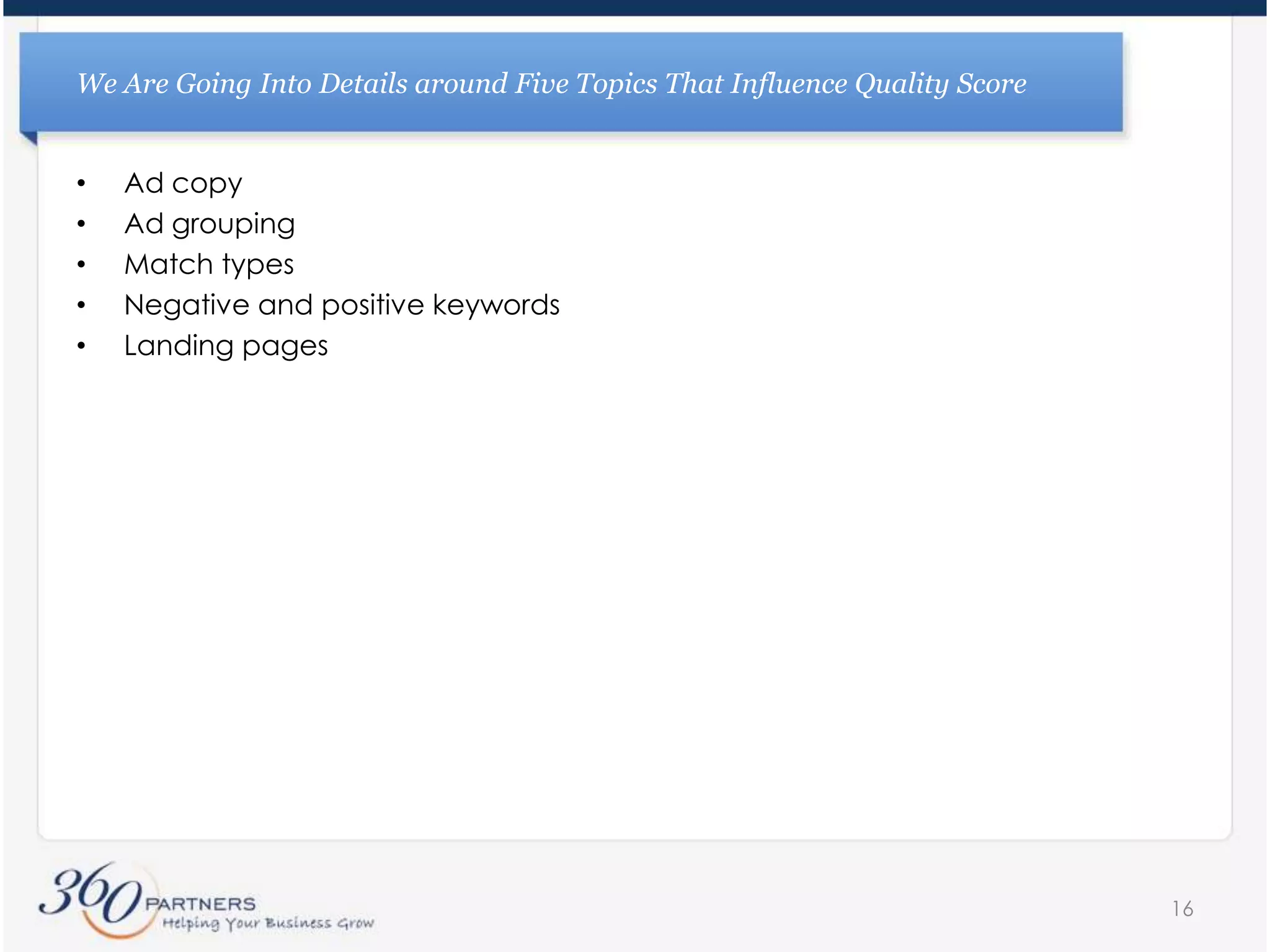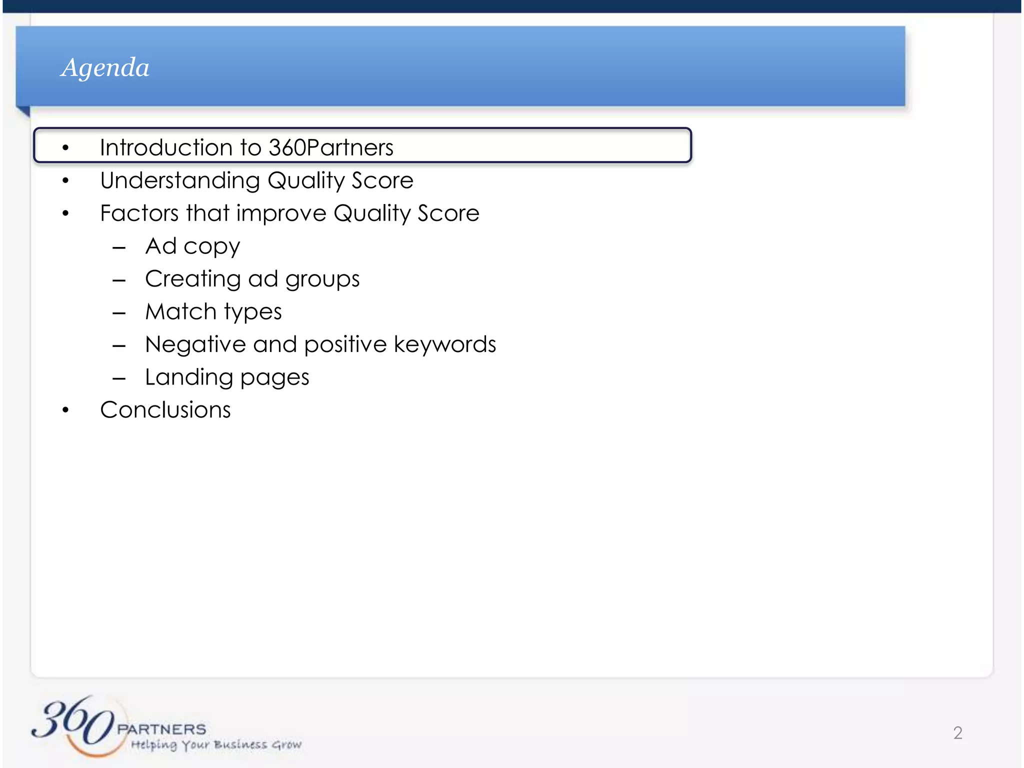This document provides an overview of pay-per-click search marketing. It discusses understanding quality score, which is Google's perception of the relevance of ads and keywords. Higher quality scores lead to better ad performance. The document outlines factors that influence quality score, including ad copy, ad grouping, match types, negative and positive keywords, and landing pages. It provides examples and best practices for writing effective ad copy, tightly grouping keywords into themes, and using different match types strategically. The overall goal is to teach basic theories and strategies for improving paid search performance.