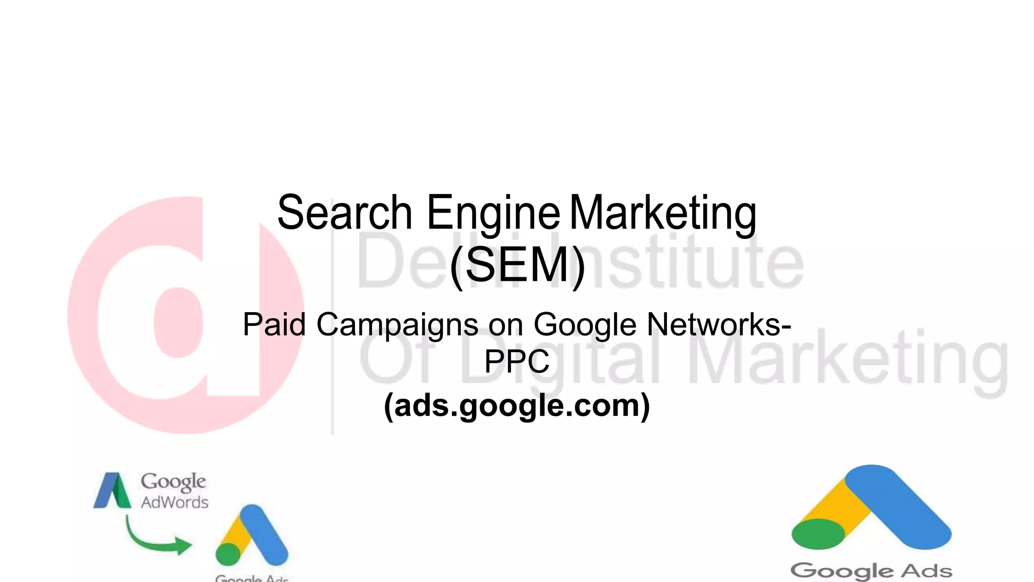 This document discusses search engine marketing (SEM) strategies, including pay-per-click (PPC) advertising on Google networks. It covers the different ad formats available on Google like text, display, video, and shopping ads. It also discusses factors that affect paid search results like ad rank, domain authority, bids, and quality score. Additionally, it provides guidance on keyword selection, match types, bidding strategies, budgeting, landing page optimization, and A/B testing.
