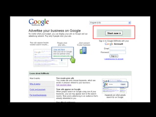 This document provides an introduction to search engine marketing (SEM) and pay-per-click (PPC) advertising on Google AdWords. It discusses the basics of how AdWords works, including how advertisers are charged on a cost-per-click (CPC) basis. The document also outlines some of the key benefits of using AdWords, such as its ability to reach global markets cost effectively and with flexibility. Setting up an AdWords campaign is described as relatively simple, though success requires more than just getting started.
