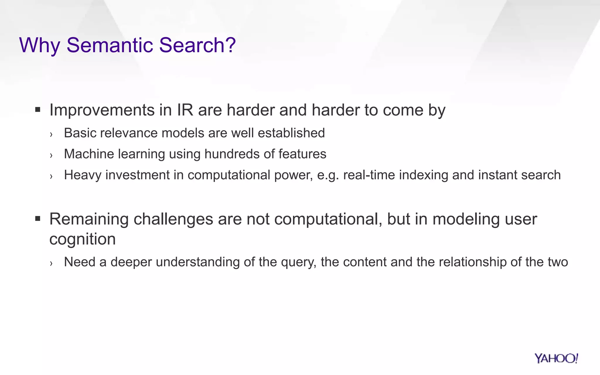 The document discusses the importance of semantic search in improving information retrieval by focusing on user intent and the relationships between queries and content. It defines semantic search as a method that utilizes both implicit and explicit semantics to model user cognition and enhance query understanding, particularly with entities. Furthermore, it touches on advancements in entity retrieval, linking processes, and ongoing research in this area.