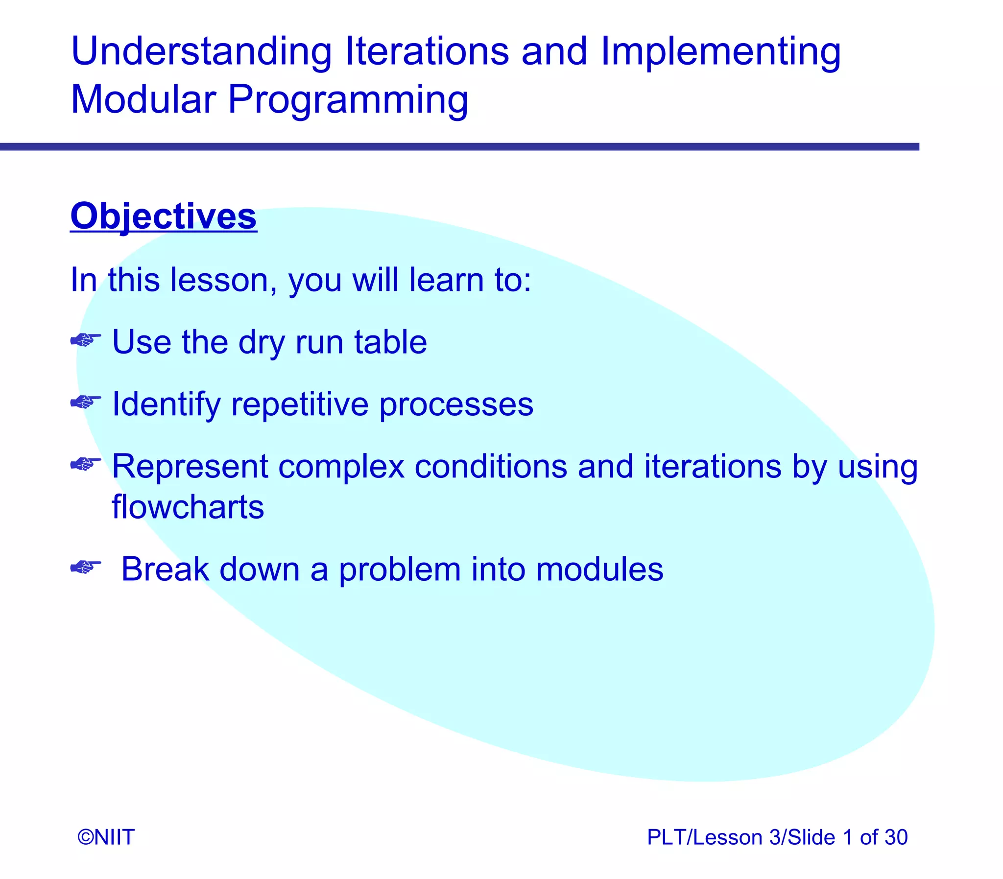 The document discusses iterations, modular programming, and flowcharts. It explains how to use dry run tables to evaluate a program's logic and output. It also describes how to represent repetitive processes and complex conditions using loops and modular structures in flowcharts. Breaking problems into smaller modules is an important part of the structured programming technique.