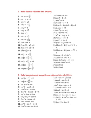 Verifique la identidad<br/>csc0-sen 0=cot0cos0<br />senx+cos xcotx=cscx<br />sec22u-1sec22u=sen22u<br />tant+2 cos t csc=sectcsct+cott<br />csc2 01+tan20=cot20<br />tanu+cotucosu+sen u=cscu+secu<br />1+cos3tsen 3t+sen 3t1+cos3t=2csc3t<br />tan2 a-sen2a=tan2asen2a<br />11-cosy +11+cosy=2csc2y<br />1+csc3Bsec 3B-cot3B=cos3B<br />(sec u-tan u)(cscu+ 1)=cotu<br />cot0-tan0sen 0+cos0=csc0-sec0<br />csc4t-cot4t=csc2t+cot2t<br />cos4 20+sen2 20=cos220+sen220<br />cosB1 sen B=secB+tanB<br />1cscy-cot=csc+coty<br />tan2xsec x+1+11+cosy=2csc2y<br />cotxcscx+1=cscx - 1cotx<br />cot4u-1cot4u+1=1-tan4u 1+tan4u <br />1+sec4x sen 4x+tan 4x=csc4x<br />sen4r-cos4r=sen2r-cos2r<br />sen40+2sen20 cos20+cos4=1<br />tan4K-sec4K=1-2sec2K<br />sec4u-sec2u=tan2u-tan4u<br />sect+tan t2=1+sen t1-sen t<br />sec2y+tan2y=1-sen4ysec4 y<br />sen20+cos2 03=1<br />sen t1-cost=csct+cott<br />1+cscBcotB+cosB=secB<br />cos3x-sen3xcos x-sen x=1+sen xcosx<br />(csc t-cot t)4csct+cott4=1<br />(a cos t-b sen t)2+asent+b cost2=a2+b2<br />sen acosB+cps a sen BcosacosB-sen a sen B+tana+tanB1-tana tanB<br />tan u- tanv1+tanutanv+cotv-cotucotucotv+1<br />tan a1+seca+1+secatana=2csca <br />csc x1+cscx-cscx1-cscx=2 sec2x<br />1tanB+cotB=sen BcosB<br />coty- tan ysen ycosy =csc2y-sec2y<br />sec 0+ csc 0- cos-sen 0=sen 0tan0+cos0cot0<br />sen3 + cos3 t =1-sen tcostsen t+cost<br />Hallar todas las soluciones de la ecuación.<br />sen x=-22<br />cost=-1<br />tanθ=3<br />cotα=-13<br />secβ=2<br />cscγ=2<br />sinx=π2<br />cosx=-π3<br />cosθ=1secθ<br />cscθsinθ=1<br />2cos2θ-3=0<br />2sin3θ+2=0<br />3tan13t=1<br />cos14x=-22<br />sinθ+π4=12<br />cosx-π3=-1<br />sin2x-π3=12<br />cos(4x-π4)=22<br />2cost+1=0<br />cotθ+1=0<br />tan2x=1<br />4cosθ-2=0<br />(cosθ-1)(sinθ+1)=0<br />2cosx=3<br />sec 2α-4=0<br />3-tan2β=0<br />3+2sinβ=0<br />4sin2x-3=0<br />cot2x-3=0<br />sint-1cost=0<br />2sinθ+12cosθ+3=0<br />2sinu-1cosu-2=0<br />cosx+1=2sin2x<br />2cos2x+sinx=1<br />sin2xcsc2x-2=0<br />tanα+tan2α=0<br />coslnx<br />lnsinx<br />Hallar las soluciones de la ecuación que están en el intervalo [0,2π).<br />cos2x-π4=0<br />sin3x-π4=1<br />2-8cos2t=0<br />cot2θ-cotθ=0<br />2sin2u=1-sinu<br />2cos2t+3cost+1=0<br />tan2xsinx=sinx<br />secβcscβ=2cscβ<br />2cos2γ+cosγ=0<br />sinx-cosx=0<br />sin2θ+sinθ-6=0<br />2sin2u+sinu-6=0<br />1-sint=3cost<br />cosθ-sinθ=1<br />cosα+sinα=1<br />3sint+cost=1<br />2tant-sec2t=0<br />tanθ+secθ=1<br />cotα+tanα=cscαsecα<br />sinx+cosxcotx=cscx<br />2sin3x+sin2x-2sinx-1=0<br />bsec5θ=4secθ<br />