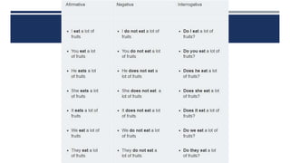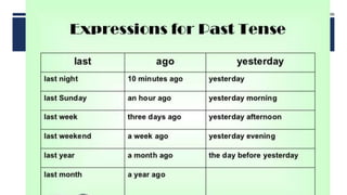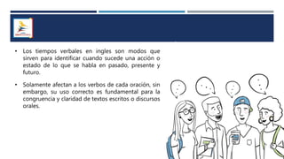 The document discusses English verb tenses and their importance for clear written and spoken communication. It explains that verb tenses identify when an action occurs in the past, present, or future. The simple past tense is then examined in more detail, noting that it is used to talk about completed actions or situations in the past. Both regular and irregular verbs are discussed, with examples provided of how to form the simple past of regular "-ed" verbs and common irregular verb forms. Guidance is given on using the simple past tense to talk about specific past events, series of past actions, repeated past habits, and general past facts.
