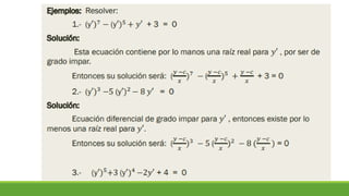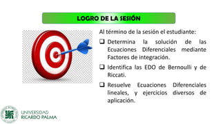 El documento resume los conceptos clave de las ecuaciones diferenciales abordados en la sesión 6, incluyendo el método de factor integrante para resolver ecuaciones diferenciales no exactas, ejemplos de factores de integración, y la forma estándar de resolver ecuaciones diferenciales lineales de primer orden.