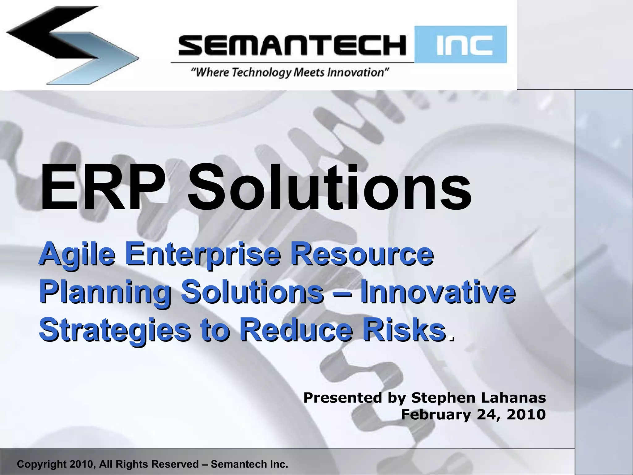 The document introduces Semantech Inc.'s approach to ERP transformation, which aims to redefine industry best practices. Their Agile ERP solution deploys capabilities incrementally using rapid assessments and integrated teams to reduce risks. It provides oversight, holistic implementation addressing processes, data and systems, and recovery services when projects fail traditionally.