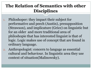 2. There are three views on the relationship between semantics and pragmatics: semanticism argues pragmatics is part of semantics; pragmaticism argues semantics is part of pragmatics; complementarism argues they are distinct but complementary fields.