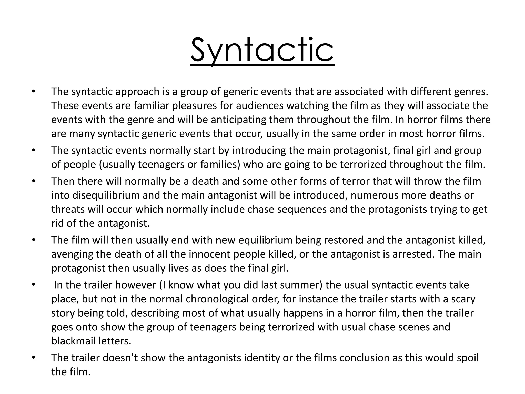 The document discusses how genre is identified semantically and syntactically in films and trailers. Syntactically, horror films follow predictable patterns of events such as introducing the protagonists, deaths occurring to create conflict, and the antagonist being defeated. Semantically, elements like dark locations, lighting, sounds, and music are used to create tension and signify danger. The trailer for "I Know What You Did Last Summer" follows some but not all of the usual syntactic events and does not reveal the antagonist or ending to avoid spoilers.