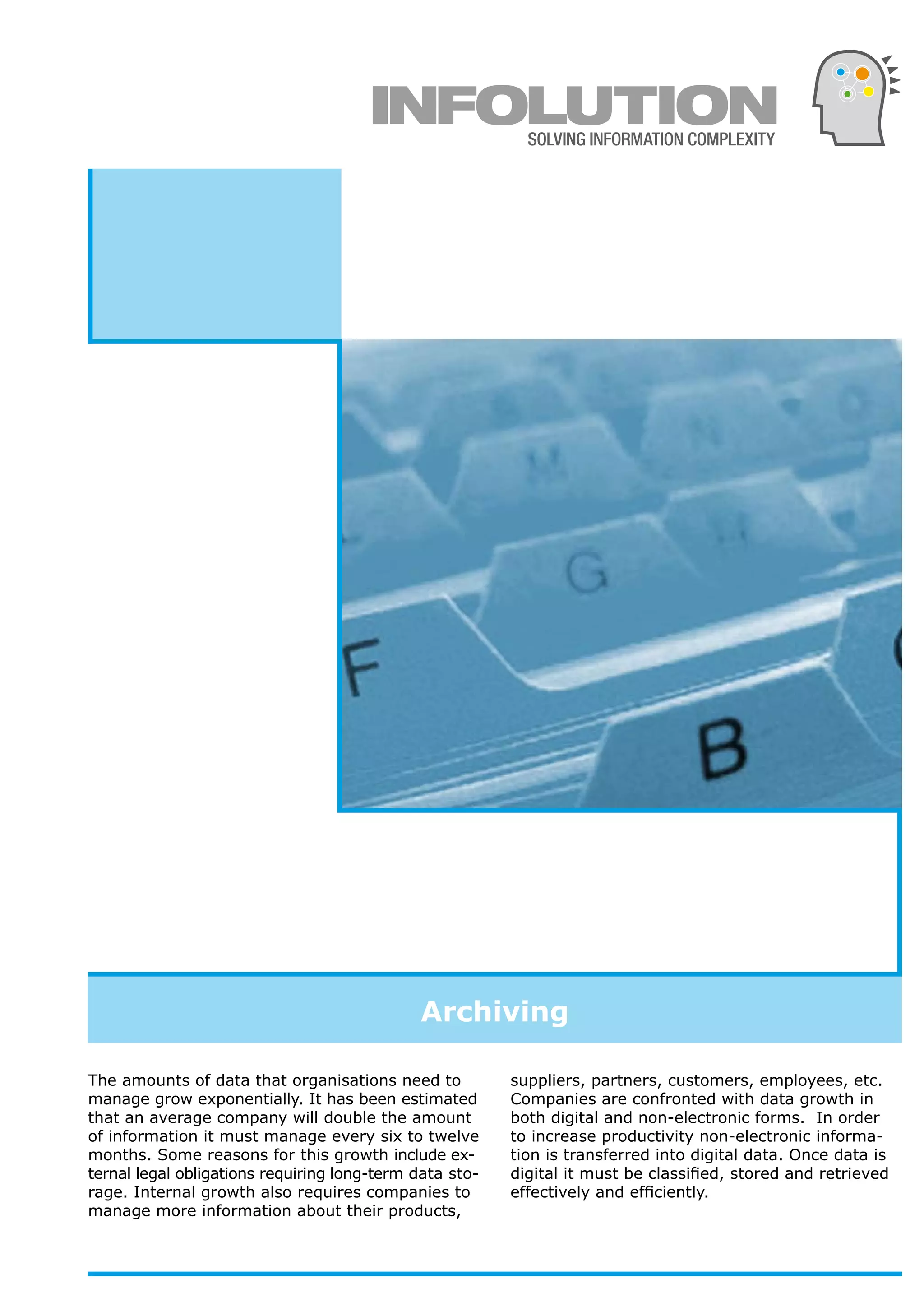 Organizations face exponential growth in data, requiring them to manage both digital and non-electronic information effectively. Estimates suggest that the average company will double its data every six to twelve months due to external legal obligations and internal growth. This necessitates efficient classification, storage, and retrieval of data.