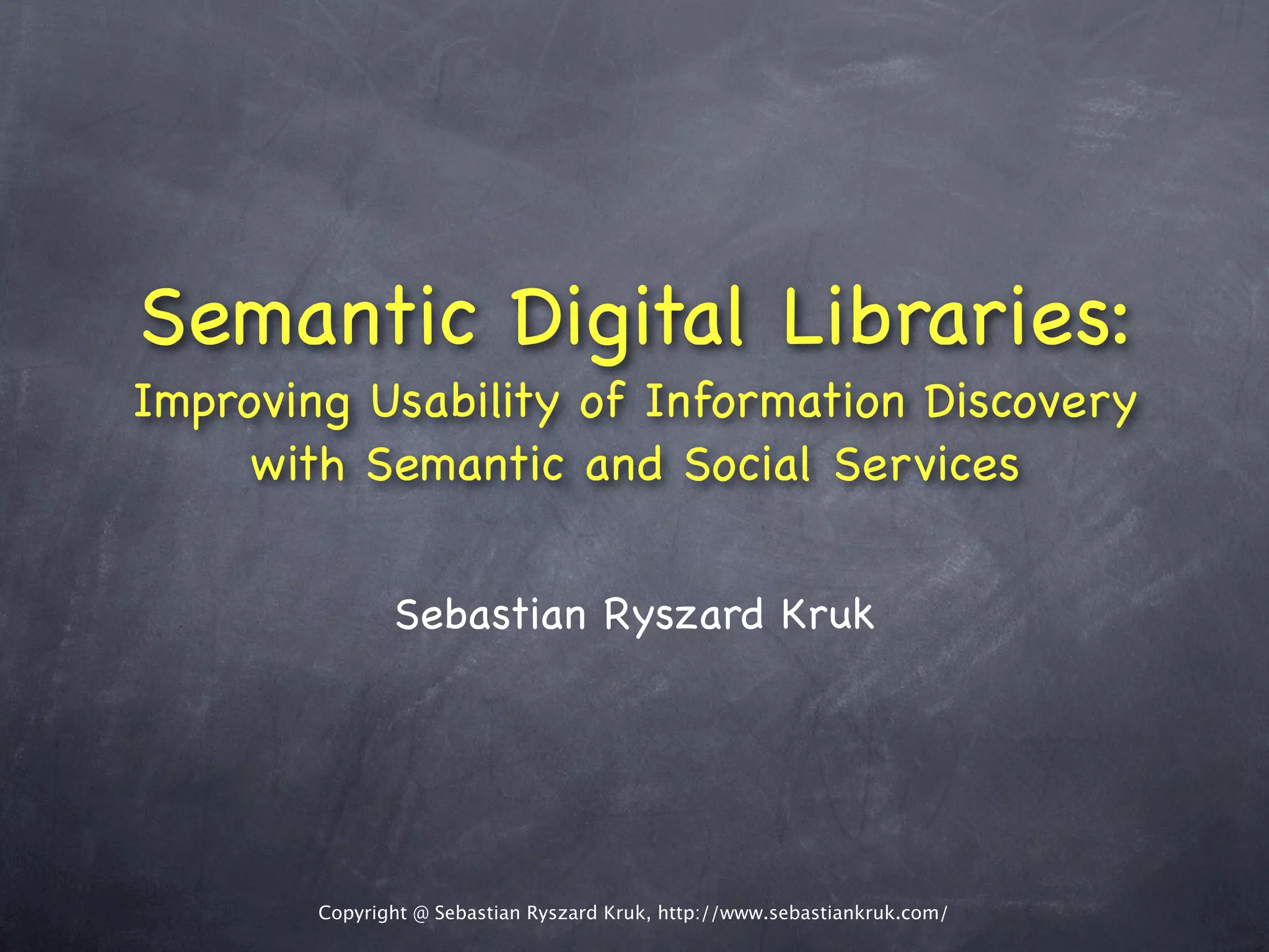 This document discusses improving digital library usability through semantic and social technologies. It presents the problem statement that digital library users lack guidance from librarians and connections with other users and information sources. The hypothesis is that semantic and social technologies can improve information discovery over classic approaches. It outlines an architecture and ontologies for a semantic digital library called SemDL. It also describes a prototype semantic digital library system called JeromeDL and its features like advanced search, social networking, collaborative filtering and browsing. It evaluates JeromeDL against a classic digital library and finds JeromeDL has better usability and user experience.