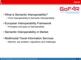 The document discusses semantic interoperability in the transport domain, defining it as the ability of systems to exchange information based on its meaning. It outlines the European Interoperability Framework and its principles, types of interoperability, and key challenges and enablers for multimodal travel information services. Additionally, it highlights both industry and research solutions aimed at improving interoperability in the transport sector.