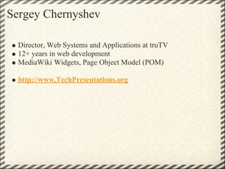 The document discusses the Semantic MediaWiki and Semantic Forms as tools for enhancing wiki functionalities. Sergey Chernychev and Yaron Koren presented their experiences and features of these tools, focusing on semantic data handling and user-friendly forms for data entry. It emphasizes the importance of making structured data easily queriable and retrievable while hiding complex data structures from users.