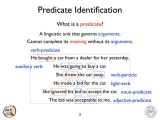 This document provides an overview of semantic role labeling in natural language processing. It discusses key concepts including predicate identification, argument identification, and argument labeling. It covers semantic roles, PropBank which annotates arguments with semantic roles, and VerbNet and FrameNet which provide semantic frames and frame elements to further specify predicate-argument relations.
