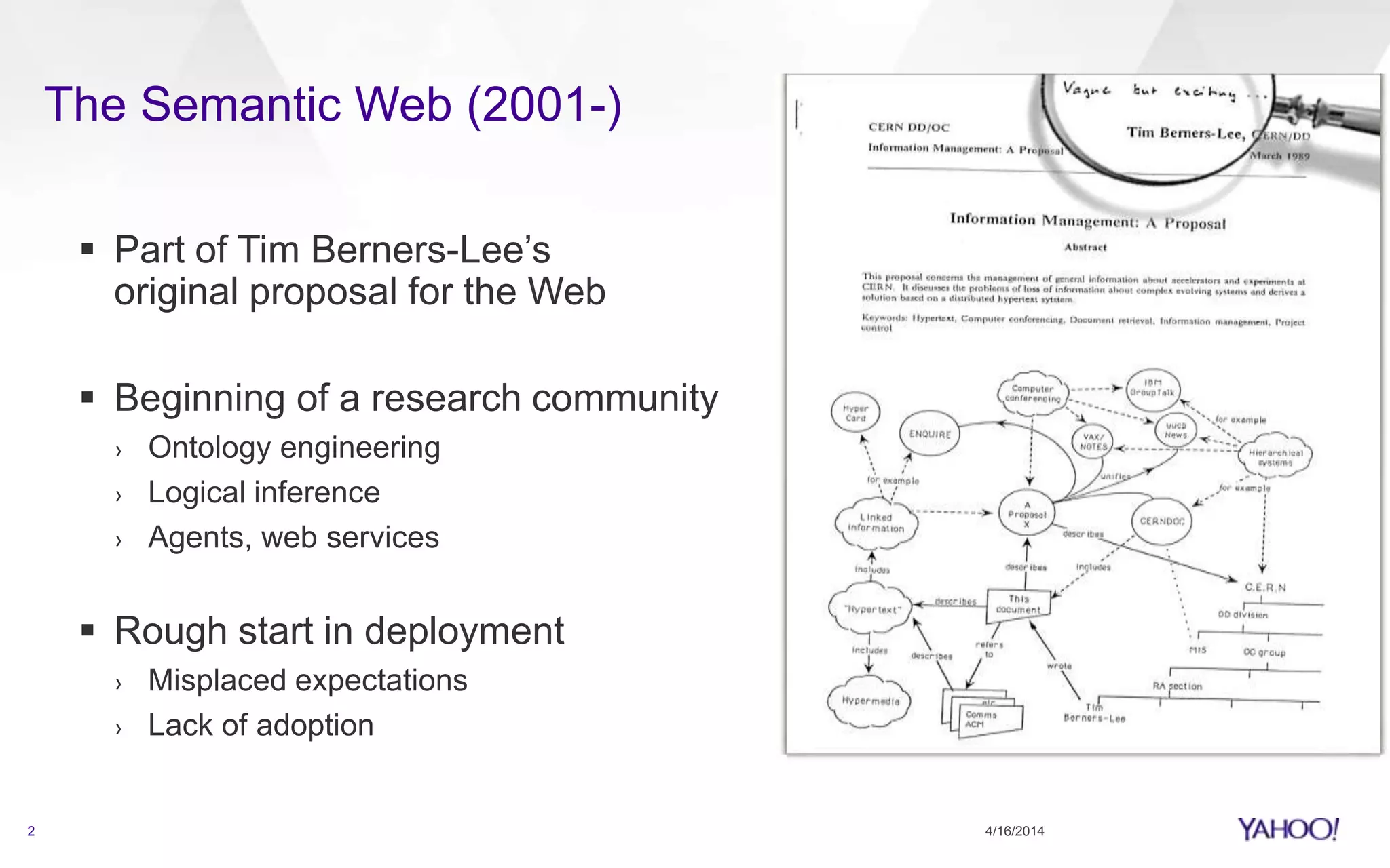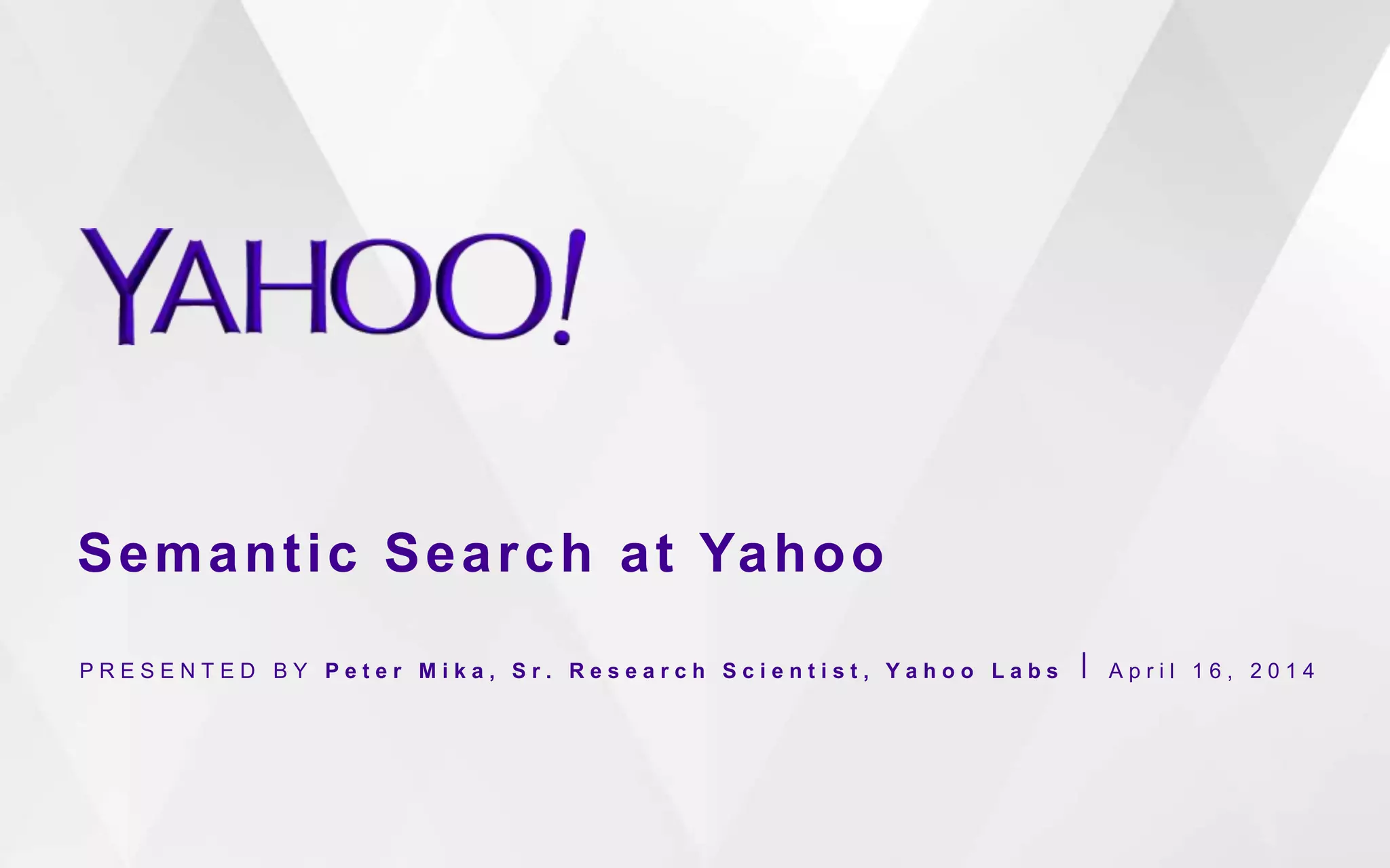 The document discusses semantic search capabilities at Yahoo. It describes how Yahoo has developed techniques to extract structured data and metadata from webpages to power enhanced search results. This includes information extraction, data fusion, and curating knowledge in a graph. Yahoo uses this knowledge to better understand search queries and present relevant entities and attributes in results. Semantic search remains an active area of research.