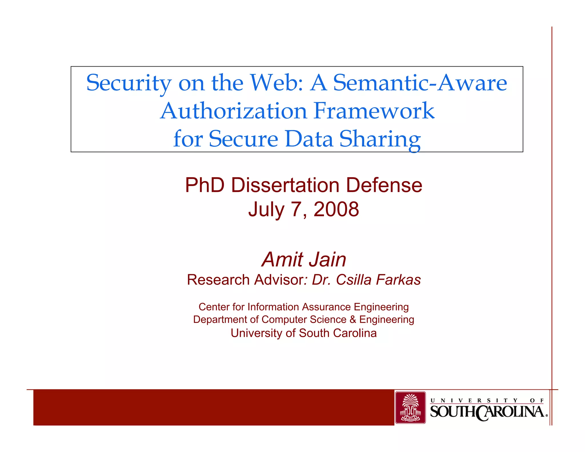 The document details a PhD dissertation defense on a semantic-aware authorization framework for secure data sharing, emphasizing the evolution of web applications and the security challenges they face. It proposes a new framework that incorporates RDF authorization models and semantic mappings to improve access control and data sharing across different systems. The research addresses limitations of existing XML security methods and aims to provide a comprehensive solution for secure, semantic-enhanced data sharing.