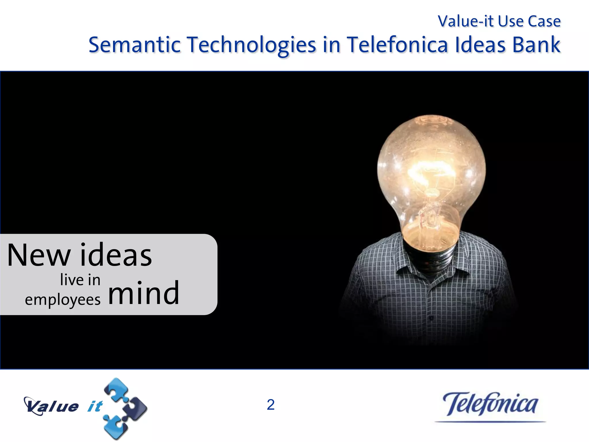 The document discusses Telefonica's use of semantic technologies in their Ideas Bank, established to foster innovation by managing and categorizing employee ideas. It highlights the challenges of managing numerous ideas and tags, leading to the adoption of semantic technologies to enhance efficiency, reduce errors, and streamline the process. Overall, the integration of these technologies has proven beneficial in promoting open innovation and improving idea management.