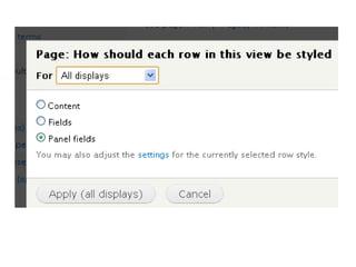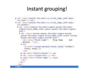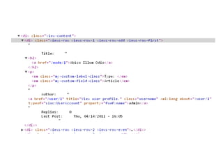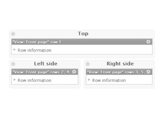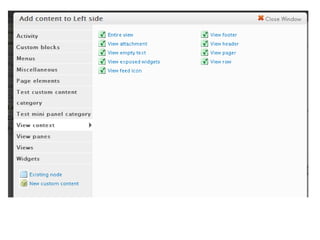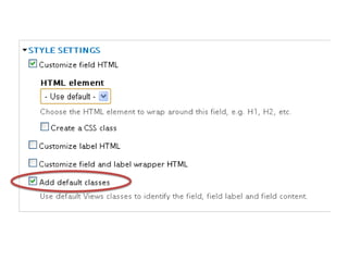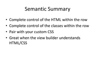 This document discusses various Drupal modules for customizing Views output, including Semantic Views, Panels, and Nodequeue. Semantic Views allows complete control over HTML elements and classes for Views rows, helping pair Views with custom CSS. Panels and Nodequeue allow grouping Views fields into layouts. While helpful for presentation, these modules can undermine separation of logic and presentation. Alternative approaches like custom layout plugins are mentioned.