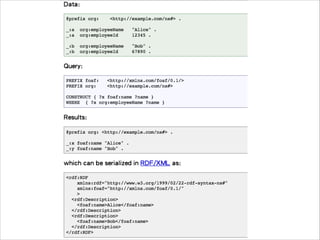 This document provides an overview of SPARQL, the query language for RDF. It describes that SPARQL allows users to write unambiguous queries over broad domains, similar to SQL for databases. The basics of SPARQL are explained, including writing simple queries with graph patterns to match RDF data, handling results, and matching different types of RDF terms and literals. Building RDF graphs from query results is also covered.