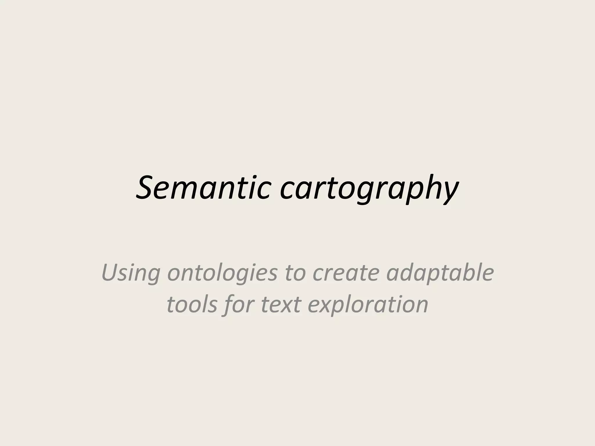 ![Ontological definitionUnderstandsIs RDF “Slice”[1]SoftwareThe Semantic Map allowsany software that can interpret RDF to work with any semantic idea that can be associated with an ontological definition.1http://rdftef.sourceforge.net/](https://image.slidesharecdn.com/dhseasr-100715084743-phpapp02/85/Semantic-Cartography-Using-ontologies-to-create-adaptable-tools-for-text-exploration-7-320.jpg)