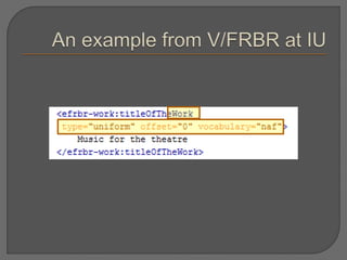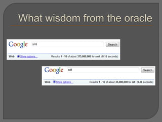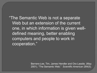 The document discusses the Semantic Web as an extension of the current web, emphasizing the use of URIs for meaningful information exchange to improve cooperation between computers and humans. It highlights challenges faced by libraries in adopting RDF and related models for metadata sharing and interoperability, and it stresses the importance of balancing infrastructure development with practical applications. Additionally, it suggests the potential for linked data to enhance library systems and encourages participation in related community projects.