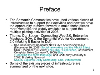 The document provides an overview of infrastructure resources being made available to support upcoming semantic technology events in 2008. It summarizes existing infrastructure pieces like Twine, Snoggle, and MashMaker. It also introduces new infrastructure resources like Bluehost hosting and the Deki wiki platform. Instructions are provided on accessing and using the different resources through tutorials and contact information.