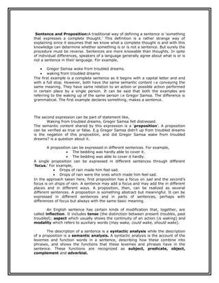 The document discusses semantics and semantic roles. It defines semantics as the study of meaning in language. Semantic roles describe the possible relationships between predicates and their arguments. The document then applies semantic role analysis to examples from Kafka's Metamorphosis. It identifies examples that fit roles like agent, action, theme, and more. The analysis shows how semantic roles help convey the full meaning of sentences and contribute to the overall text.