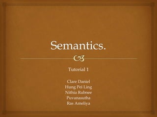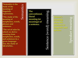 This document provides an overview of semantics and the components of language. It defines semantics as the study of meaning in language, including the meaning of words, phrases, and sentences. It also lists some of the main components of language as phonology, morphology, syntax, semantics, pragmatics, and orthography. Additionally, it summarizes John Locke's 17th century theory of semantics, which held that linguistic meaning is mental and involves encoding and decoding ideas through words.