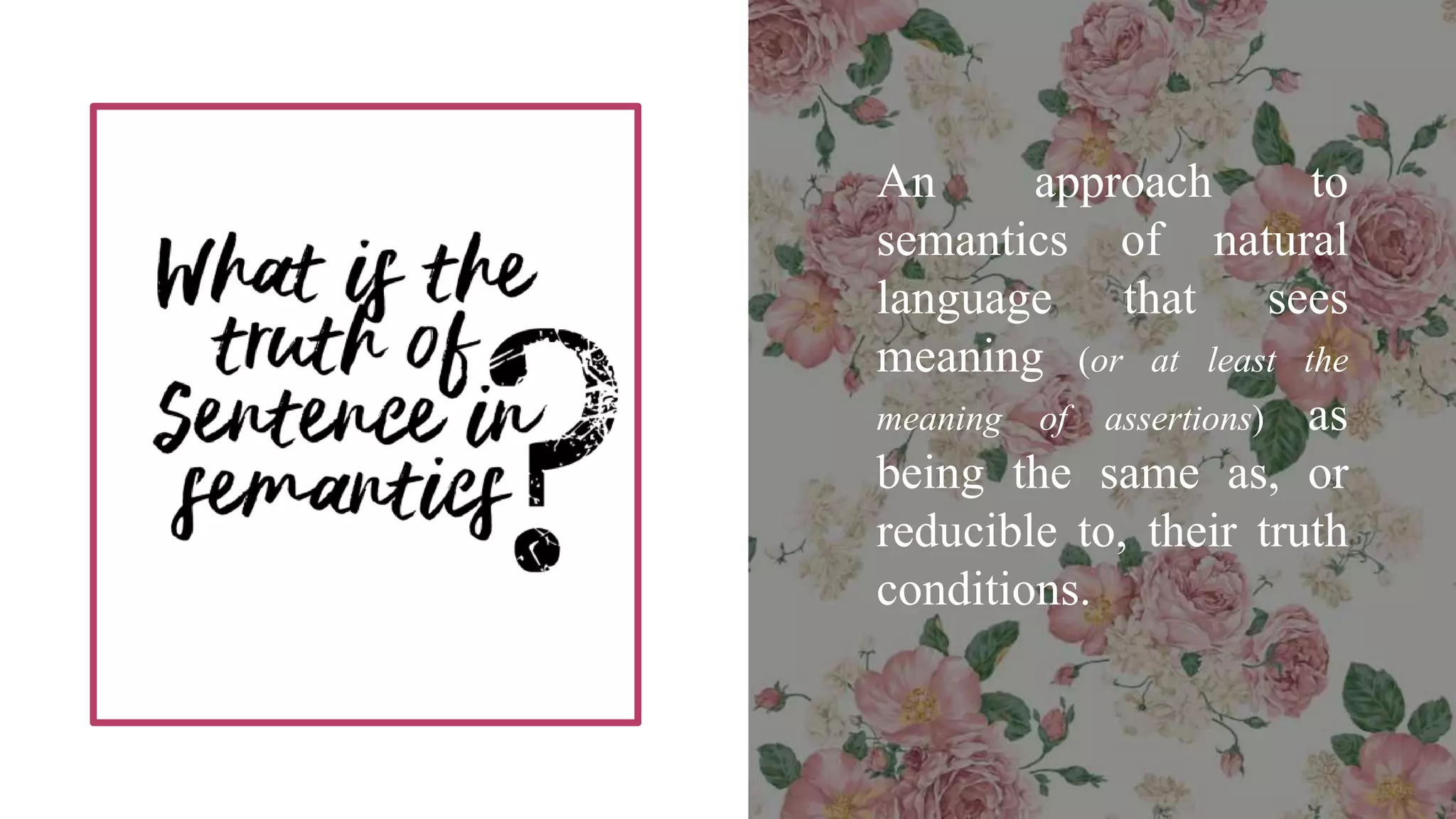 The document discusses truth-conditional semantics, which denotes meaning as equivalent to truth conditions of statements in varying possible worlds. It illustrates this with examples involving the possession of a 50 cent coin, emphasizing that understanding a statement's meaning includes knowing the conditions under which it is true. Additionally, it explains paraphrasing as a restatement that conveys semantic equivalence, albeit with variations in emphasis.