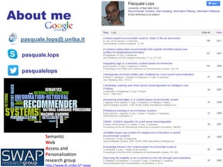 This document summarizes Pasquale Lops' presentation on semantics-aware content-based recommender systems. It discusses how content-based recommender systems traditionally rely on keyword profiles but have limitations due to issues like multi-word concepts, synonymy, and polysemy. The presentation proposes leveraging semantic text analytics techniques like word sense disambiguation, explicit semantic analysis using Wikipedia, and linked open data to move beyond keyword profiles and address issues like overspecialization and lack of serendipity in recommendations.