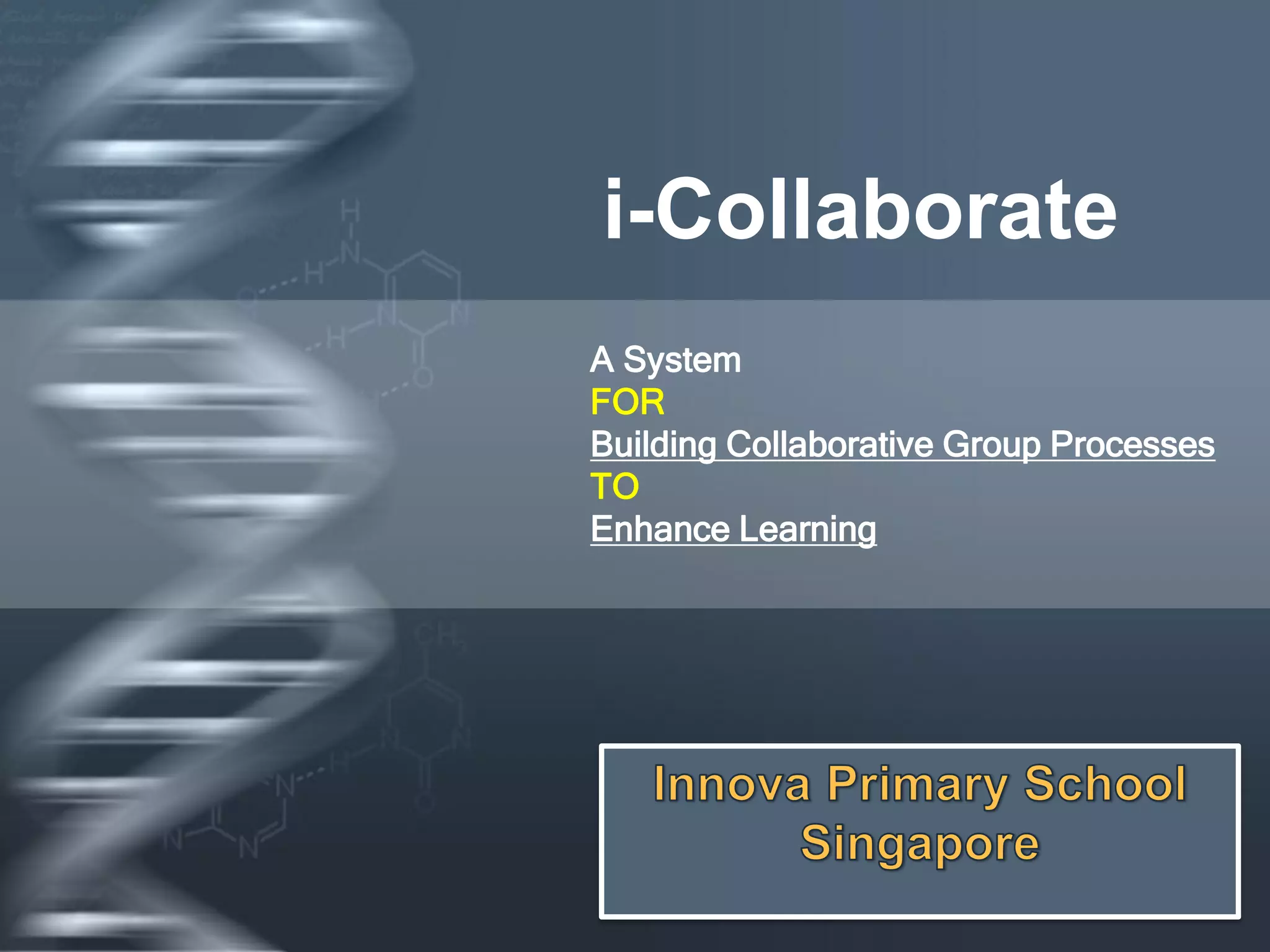 The document describes a system called i-Collaborate (iCS) that was developed by Innova Primary School in Singapore to enhance collaborative learning through the use of semantic analysis technology. iCS is a web-based interactive learning system that incorporates a semantic analysis engine to capture and analyze student discussions. The semantic analysis provides learning analytics and reports to help teachers identify learning gaps, learning styles, and opportunities for intervention to improve student understanding and group processes. The goal of iCS is to make student thinking and social learning visible to promote constructivist learning.