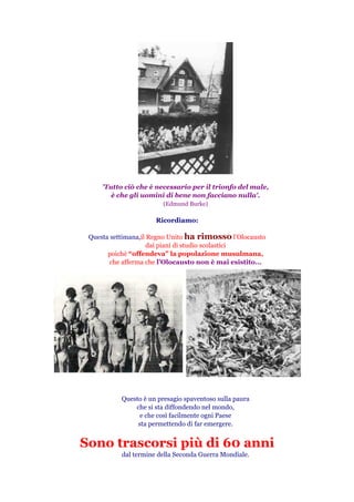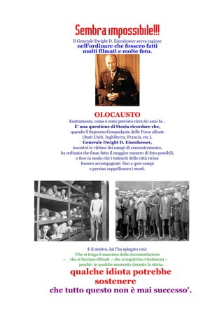 Il generale Dwight D. Eisenhower ordinò la documentazione visiva dell'Olocausto per contrastare eventuali negazioni future. Un recente evento nel Regno Unito ha suscitato preoccupazioni riguardo alla rimozione dell'Olocausto dai programmi scolastici, evidenziando una crescente paura e negazionismo. Questa comunicazione mira a ricordare le vittime e a promuovere la memoria storica, invitando a condividere il messaggio con un vasto pubblico.