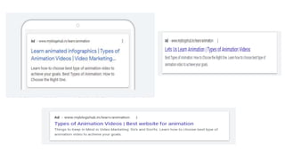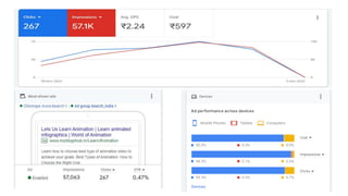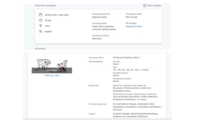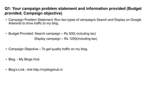 The document outlines a campaign strategy on Google AdWords to drive traffic to a blog about animation, with a total budget of Rs 1700 divided between search and display campaigns. It details the selection of 33 keywords based on relevance and search volume, identifies low-performing keywords, and suggests steps to improve quality scores. Additionally, it includes bid adjustments for devices, gender, age, and ad schedules to optimize campaign performance, while recommending specific websites for displaying ads.