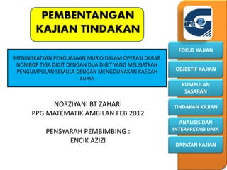 Kajian ini bertujuan meningkatkan penguasaan operasi darab nombor tiga digit dan dua digit menggunakan Kaedah Suria. Hasilnya menunjukkan peningkatan pencapaian ujian selepas intervensi dari 10% hingga 100%. Walaupun hanya separuh murid berminat terhadap matematik, semua bersetuju rasa seronok apabila menjawab soalan dengan betul.