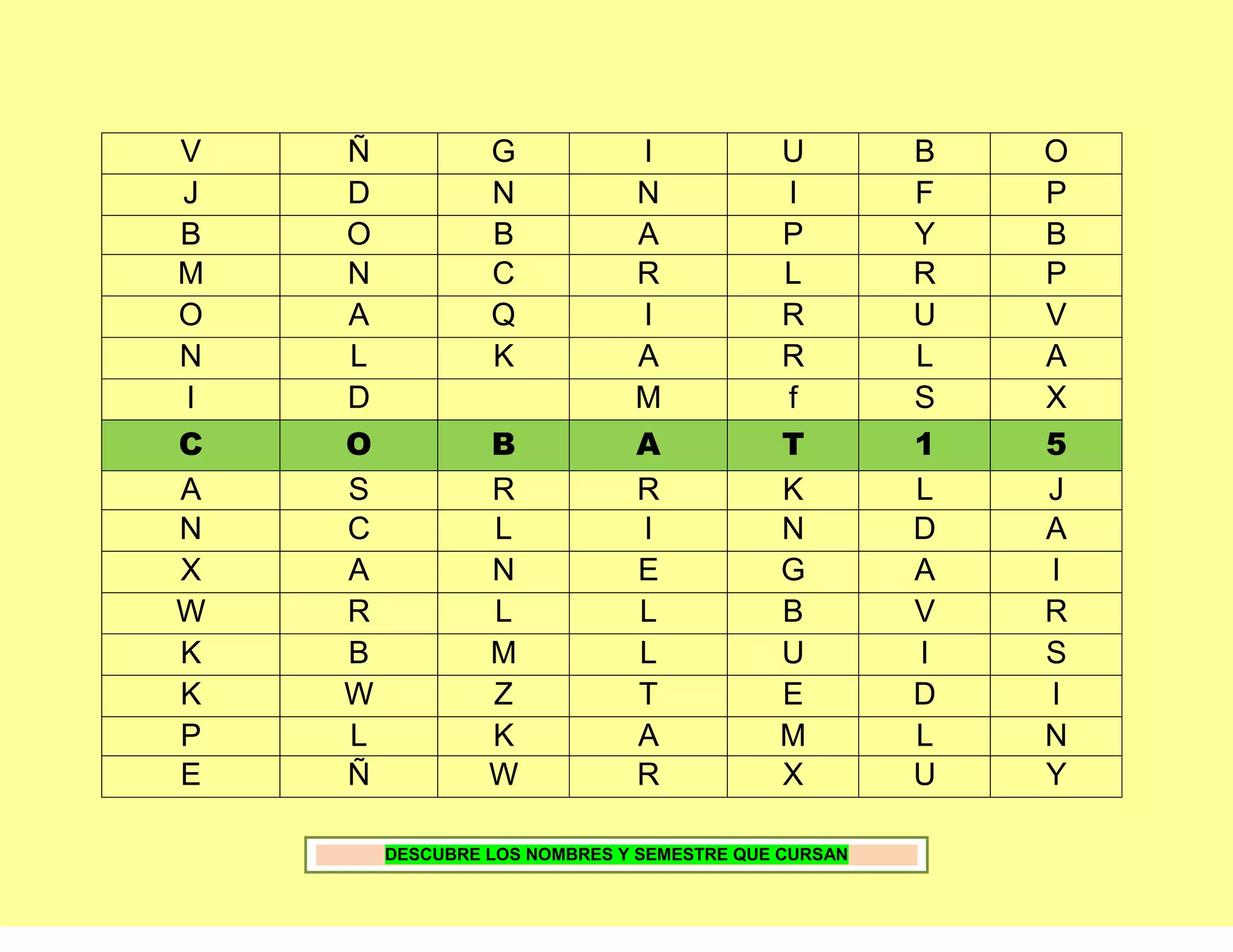 This document contains a grid of letters that are an encoded message asking the reader to discover names and semesters that students are taking based on the letters and positioning within the grid. It provides a puzzle or riddle for the reader to solve in order to uncover the intended information within the encoded message.