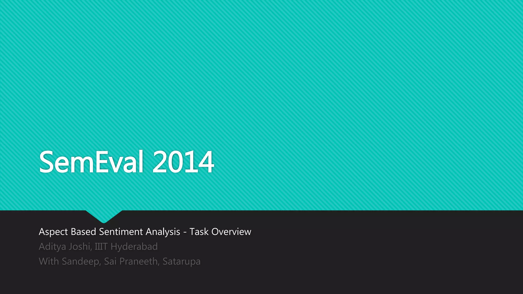 SemEval is an ongoing series of evaluations of computational semantic analysis systems that evolved from word sense evaluation. SemEval 2014 included several tasks, including aspect based sentiment analysis (Task 4) which had four subtasks: (1) aspect term extraction, (2) aspect term polarity classification, (3) aspect category detection, and (4) aspect category polarity classification. The top performing system for this task used a semi-Markov tagger for aspect term extraction and SVMs trained on lexical, syntactic, and semantic features for the other subtasks.