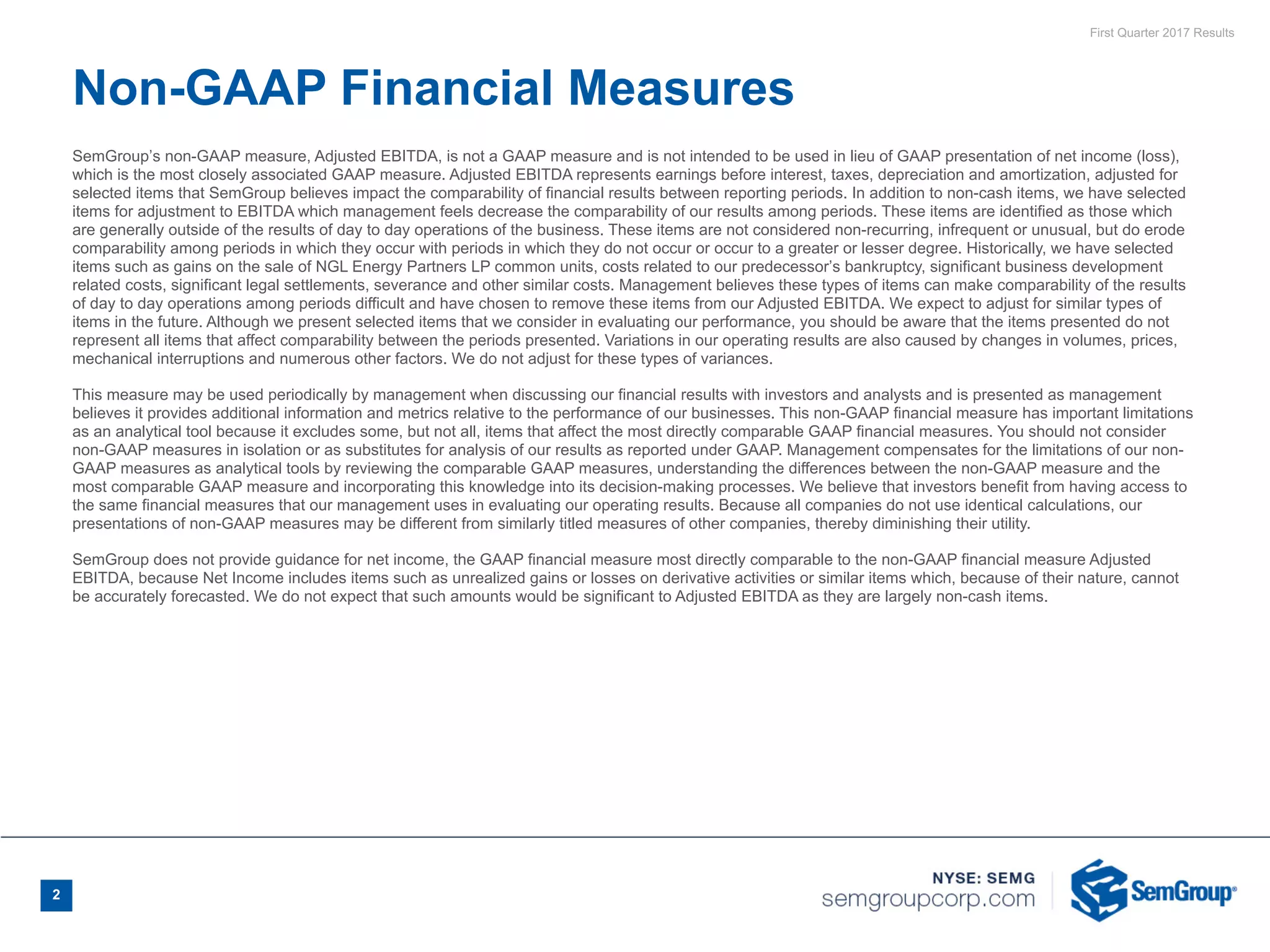 SemGroup reported adjusted EBITDA of $60.7 million for the first quarter of 2017, down from $66.2 million in the fourth quarter of 2016. The Crude Facilities segment was down nearly $5 million due to the absence of a take-or-pay adjustment in the prior quarter. SemGroup reaffirmed its 2017 adjusted EBITDA guidance range of $270-310 million and expects its annualized fourth quarter 2017 adjusted EBITDA run rate to be between $325-340 million. Key growth projects including the Maurepas Pipeline and SemGas Canton Pipeline are on track for completion by the end of 2017.