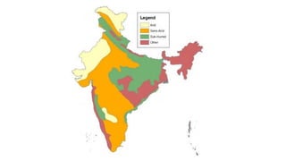 The document describes design strategies for buildings in semi-arid regions with scarce water resources, high temperatures, low humidity, and sparse vegetation. Key strategies include using courtyards to promote cross ventilation and cool interiors; buffer spaces along the south and west facing walls to shelter living areas from heat; minimizing street frontage to reduce surface heating; and using jharokhas, thick mud walls, ventilators, jalis, flat roofs, water features, light colors, and compact neighborhoods to moderate interior temperatures. Local materials like mud blocks, stone, and timber are best suited for construction.