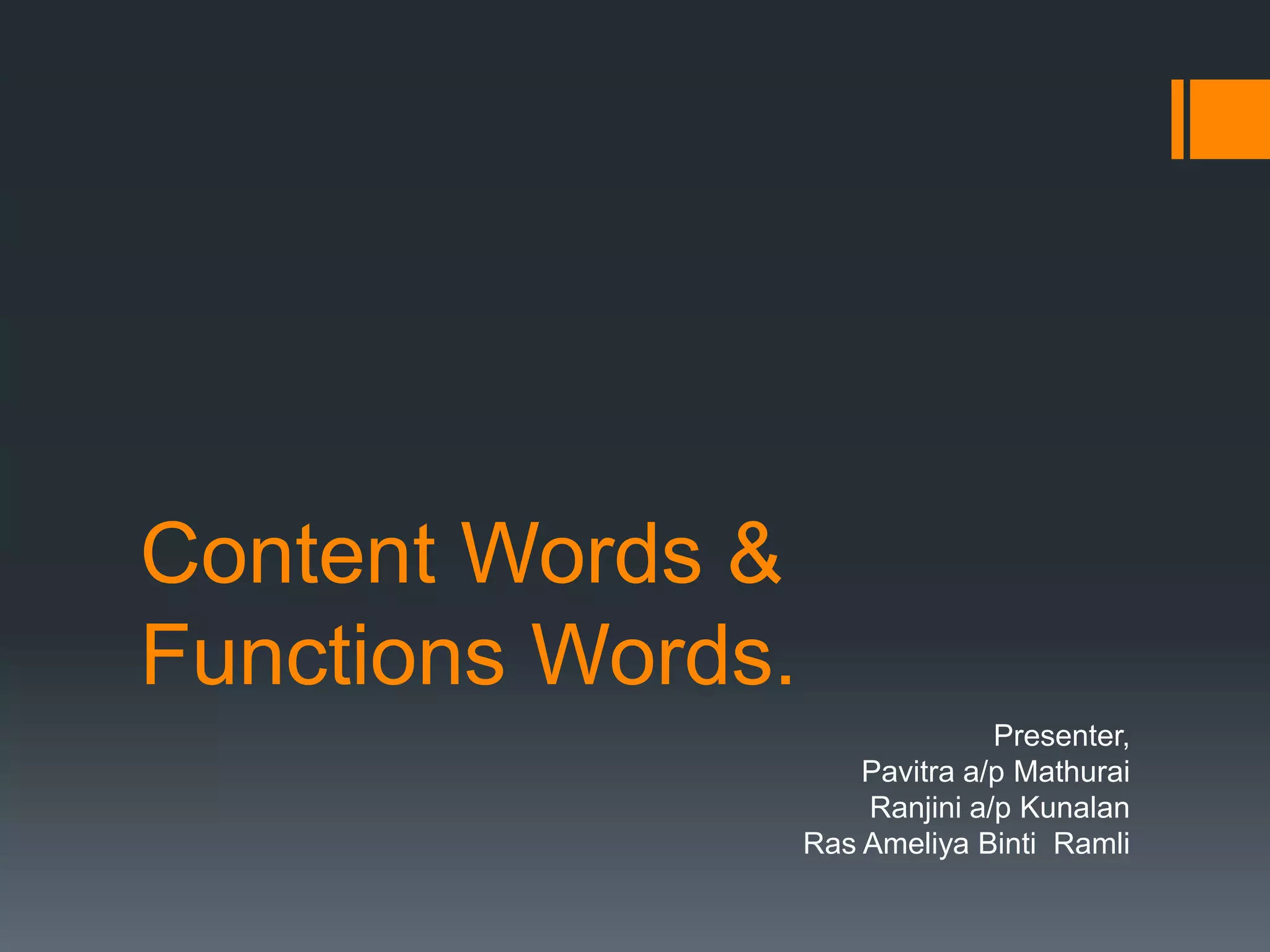 This document discusses content words and function words, as well as lexical and semi-lexical categories in linguistics. It explains that words belong to lexical categories and can form phrases according to phrase structure rules. Semi-lexical categories include prepositions, which have both lexical and functional properties. Prepositions can introduce complements or modifiers, and their classification depends on whether the prepositional phrase functions as a complement or modifier of the head noun.