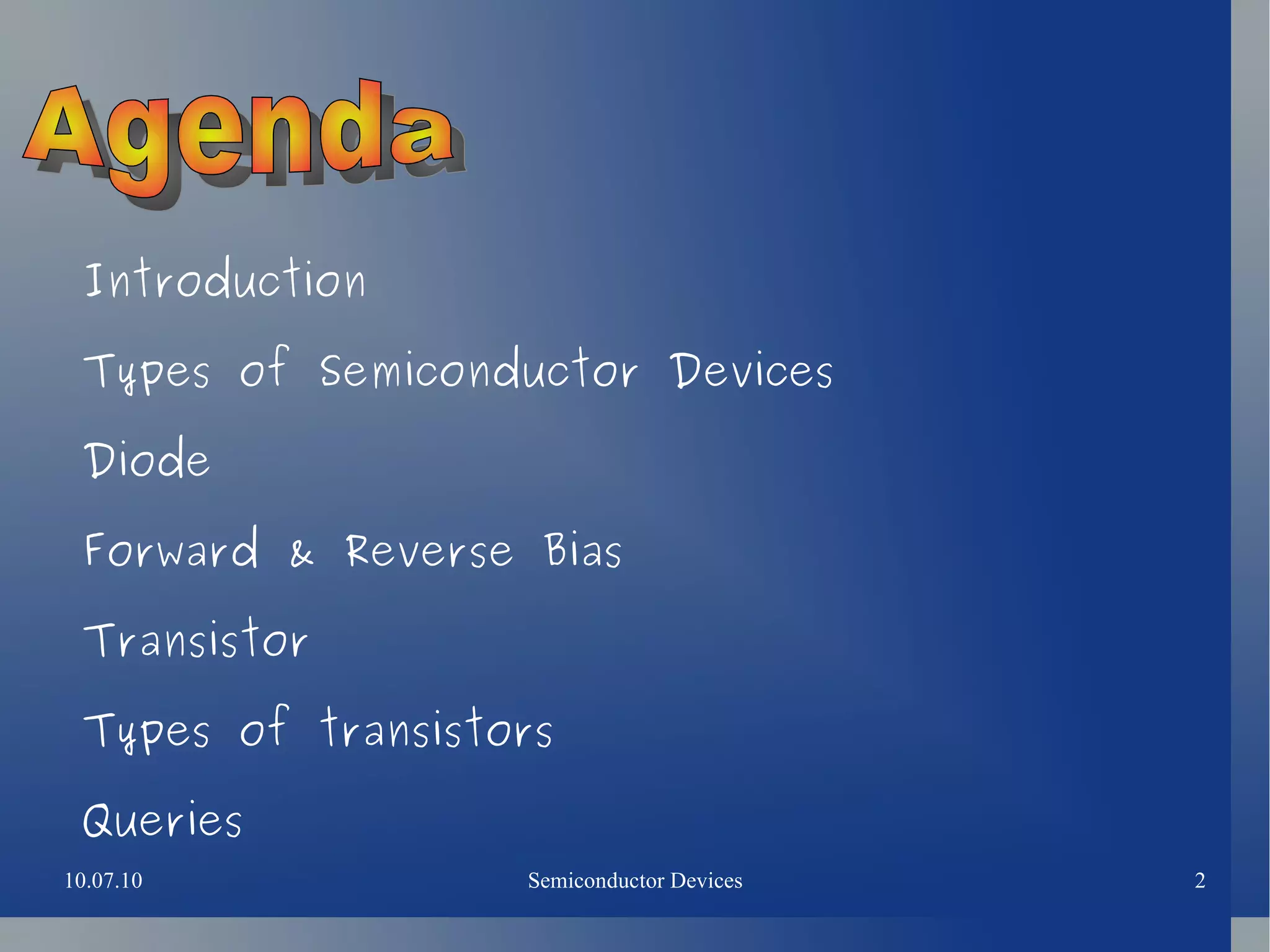 The document provides an overview of semiconductor devices, including types like intrinsic and extrinsic semiconductors, as well as diodes and transistors. It explains the functioning of p-n junctions in diodes, highlighting forward and reverse bias behaviors, and discusses different transistor types, namely p-n-p and n-p-n, detailing their structure and advantages. The content concludes with a query regarding the combination of diodes to form a transistor.