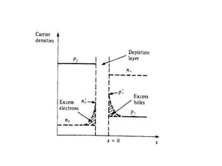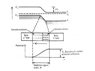 This document summarizes semiconductor junction devices, including intrinsic and extrinsic semiconductors like N-type and P-type materials. It discusses the energy levels of these materials and how PN junctions are formed between them. It also describes how current flows through a PN junction when it is forward or reverse biased. The document lists textbooks and references for further reading on topics like semiconductor optoelectronic devices and materials.