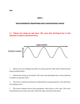 The document discusses the concepts of transverse and longitudinal waves, detailing their characteristics, equations, and behaviors when encountering boundaries. It covers topics such as wave speed, harmonic waves, standing waves, and acoustic waves, explaining phenomena like reflection, transmission, and resonance. Additionally, it highlights the significance of impedance matching in wave energy propagation across different media.