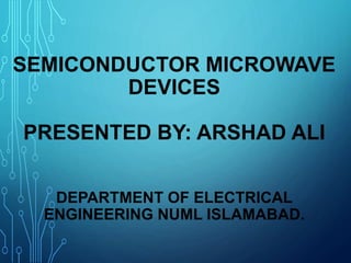 Semiconductor microwave devices are electronic components like diodes, transistors, and integrated circuits used in high frequency applications ranging from 1 GHz to 300 GHz. Common semiconductor microwave devices include PIN diodes, Gunn diodes, IMPATT diodes, and Schottky diodes which are used as switches, attenuators, microwave generators, and for generating microwave radio frequencies. Transistors like bipolar junction transistors and field effect transistors are also important semiconductor microwave devices.