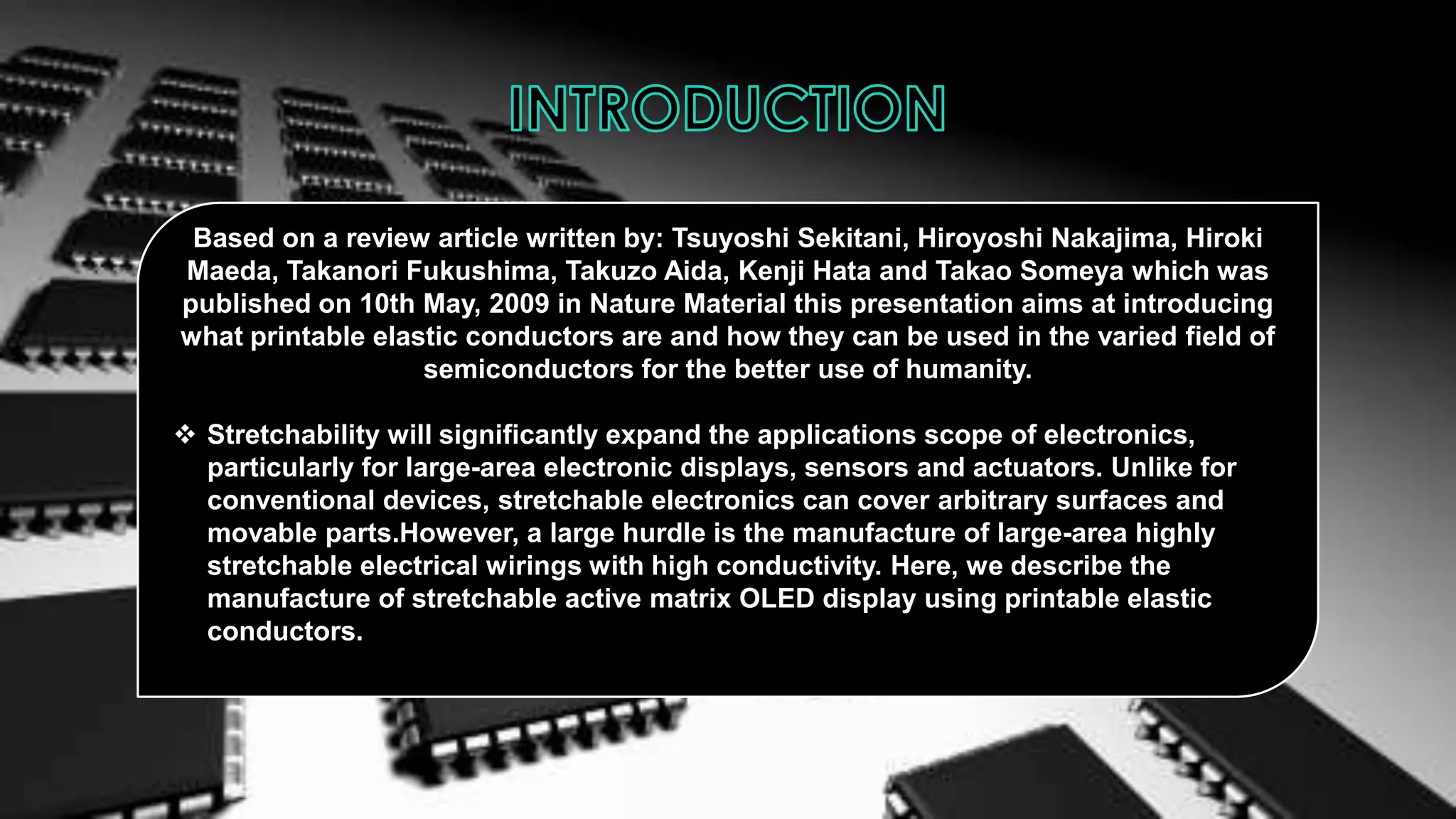 This document summarizes a research article that introduces printable elastic conductors and describes how they can be used to create a stretchable active-matrix organic light emitting diode (OLED) display. The key points are: