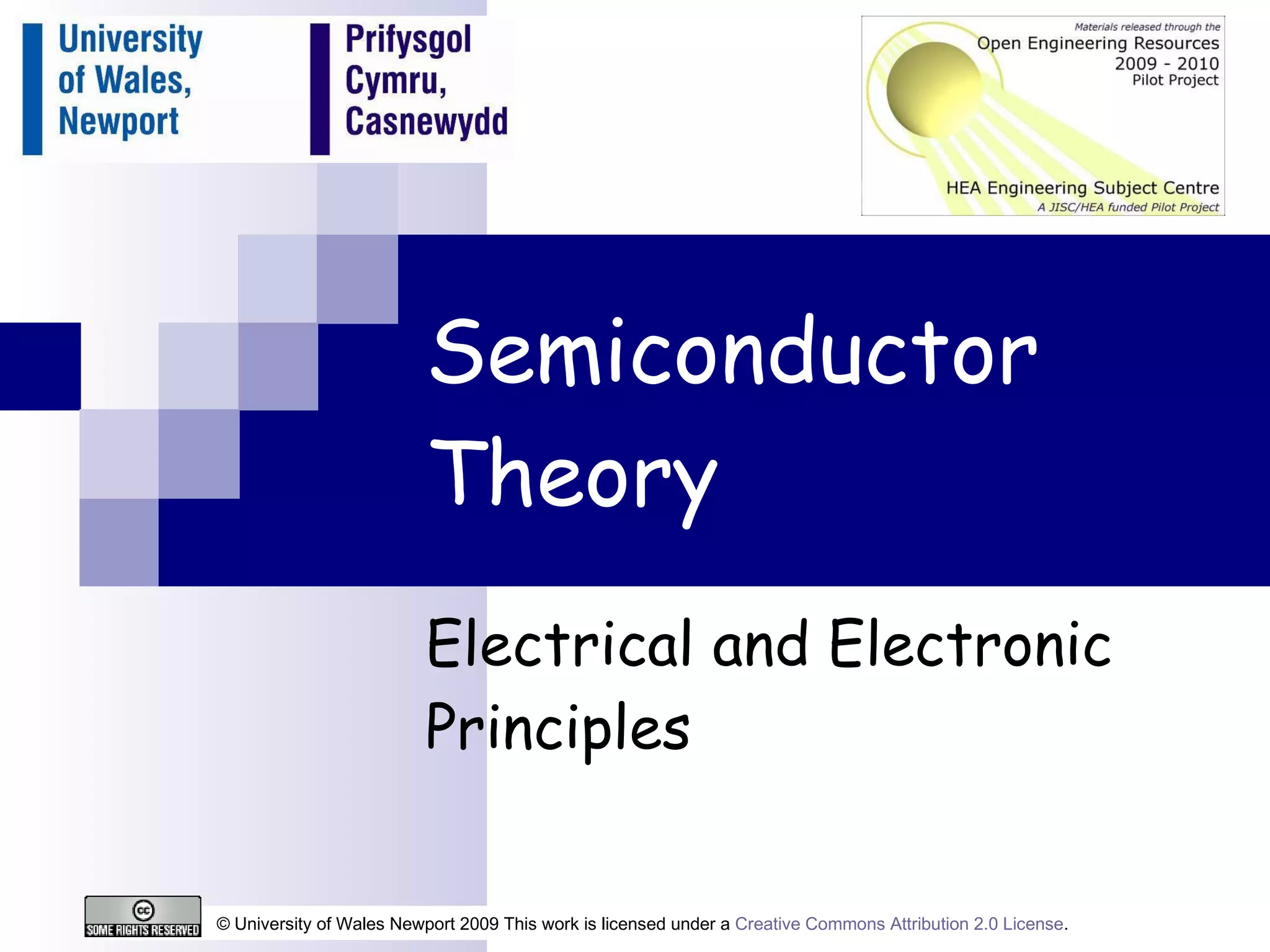 This document covers semiconductor theory as part of the University of Wales Newport's engineering courses, focusing on the principles of electrical and electronic engineering. It explains the properties of silicon as a semiconductor, including doping with impurities to create n-type and p-type semiconductors, and details the behavior of pn junctions and diodes, including forward and reverse bias. The document also discusses rectification processes for converting AC signals to DC outputs and is available under a Creative Commons license.