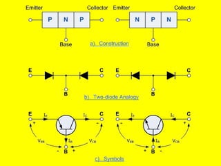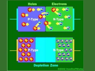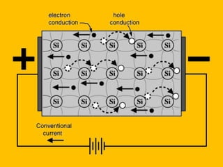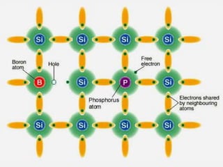 The document discusses energy band gaps in materials. It provides information on the density of electrons, energy gaps, and electric fields required for insulators, semiconductors, and metals. It then lists common materials used in semiconductors along with their band gap energies in electronvolts at 302 Kelvin. These include diamond, silicon dioxide, silicon, germanium, and lead sulfide. The document also discusses silicon-germanium alloys and intrinsic semiconductors. It covers doping, p-n junction diodes, their uses as electronic switches and rectifiers. Transistors are discussed for their uses as amplifiers, oscillators, and in integrated circuits. Radio broadcasting and reception is also mentioned